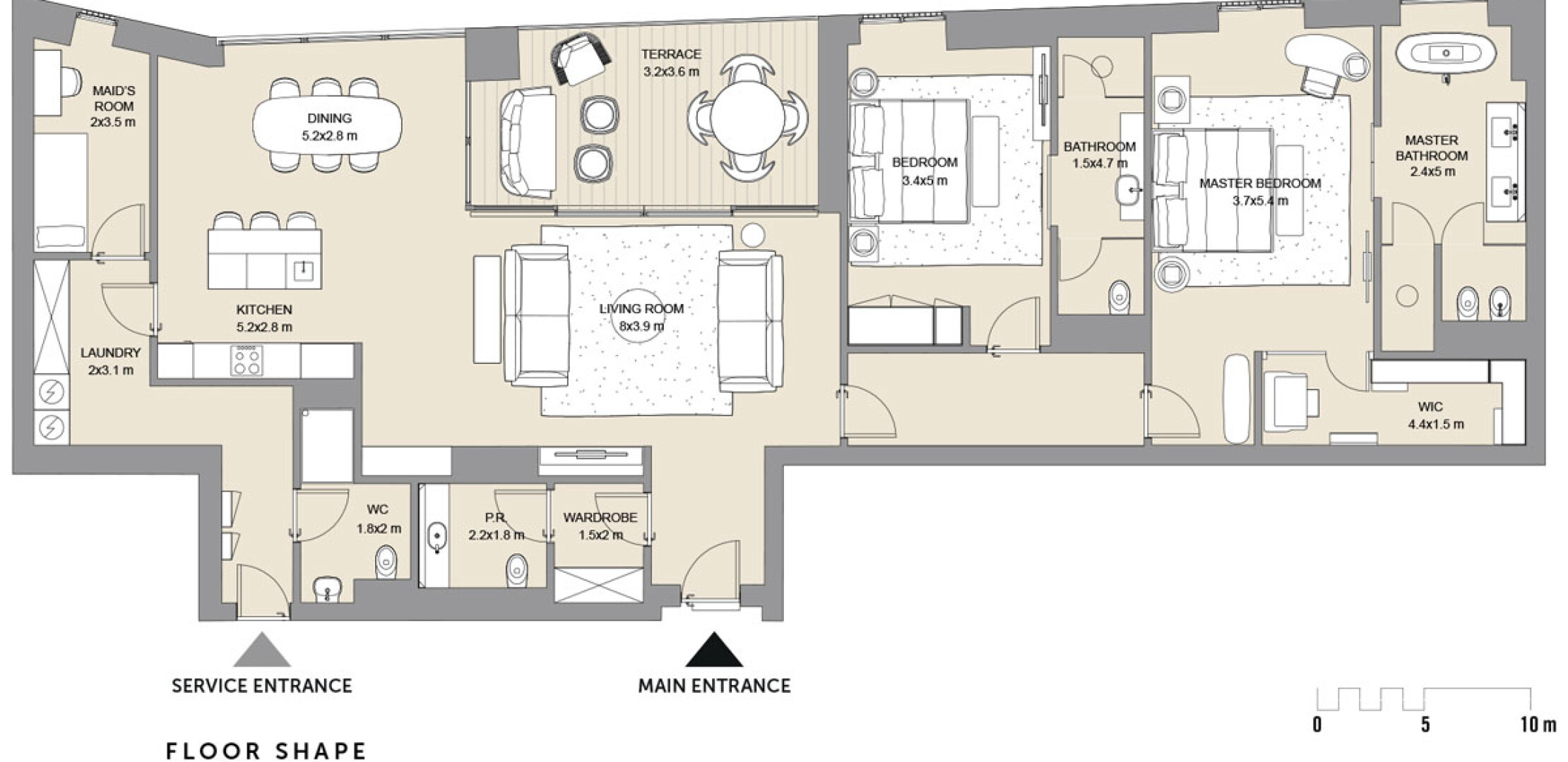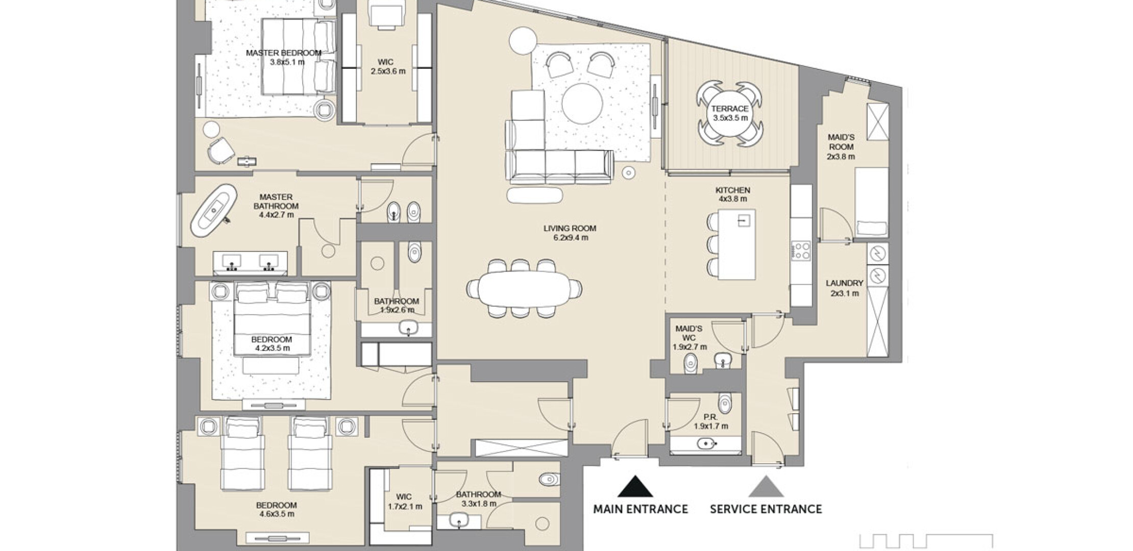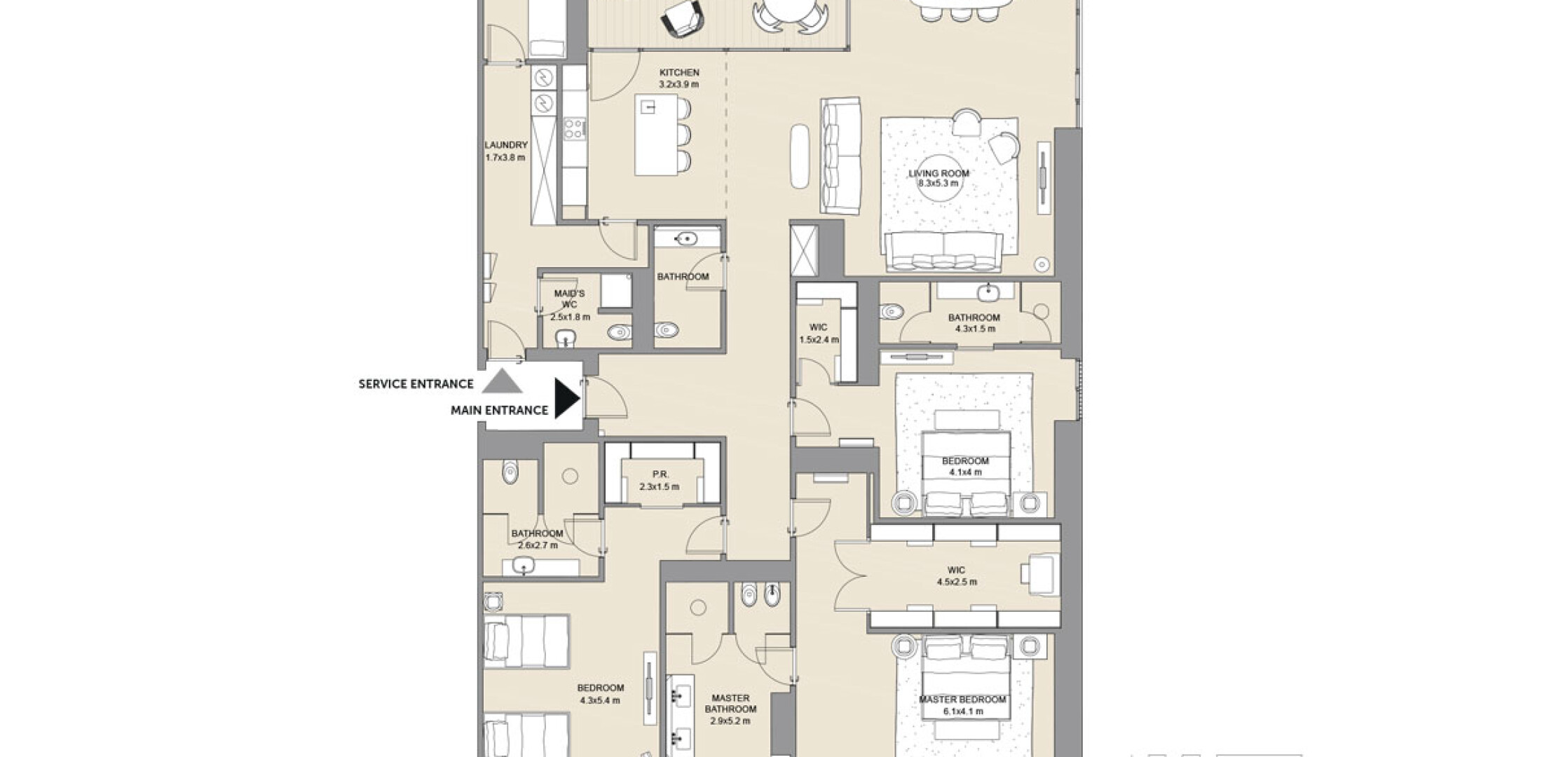 Апартаменты варьируются от 1 до 3 спален, с площадью от 137,5 до 626,91 кв.м. Каждая единица предлагает просторные планировки, высокие потолки и панорамные окна.