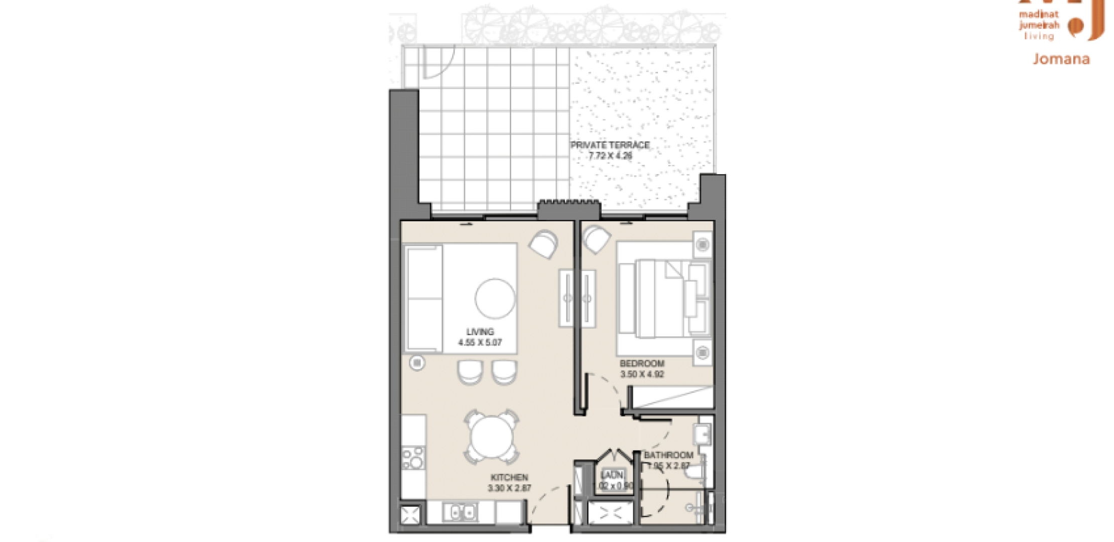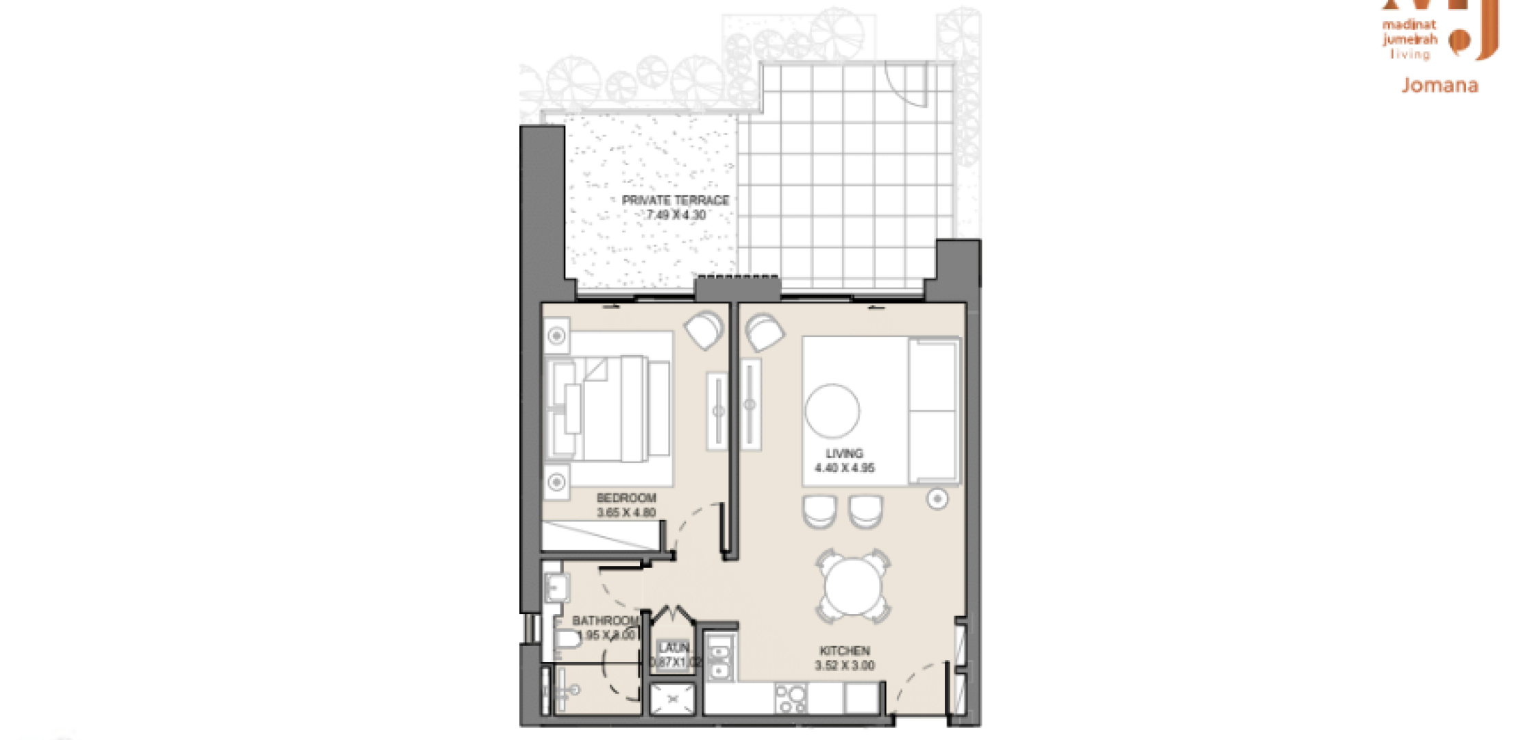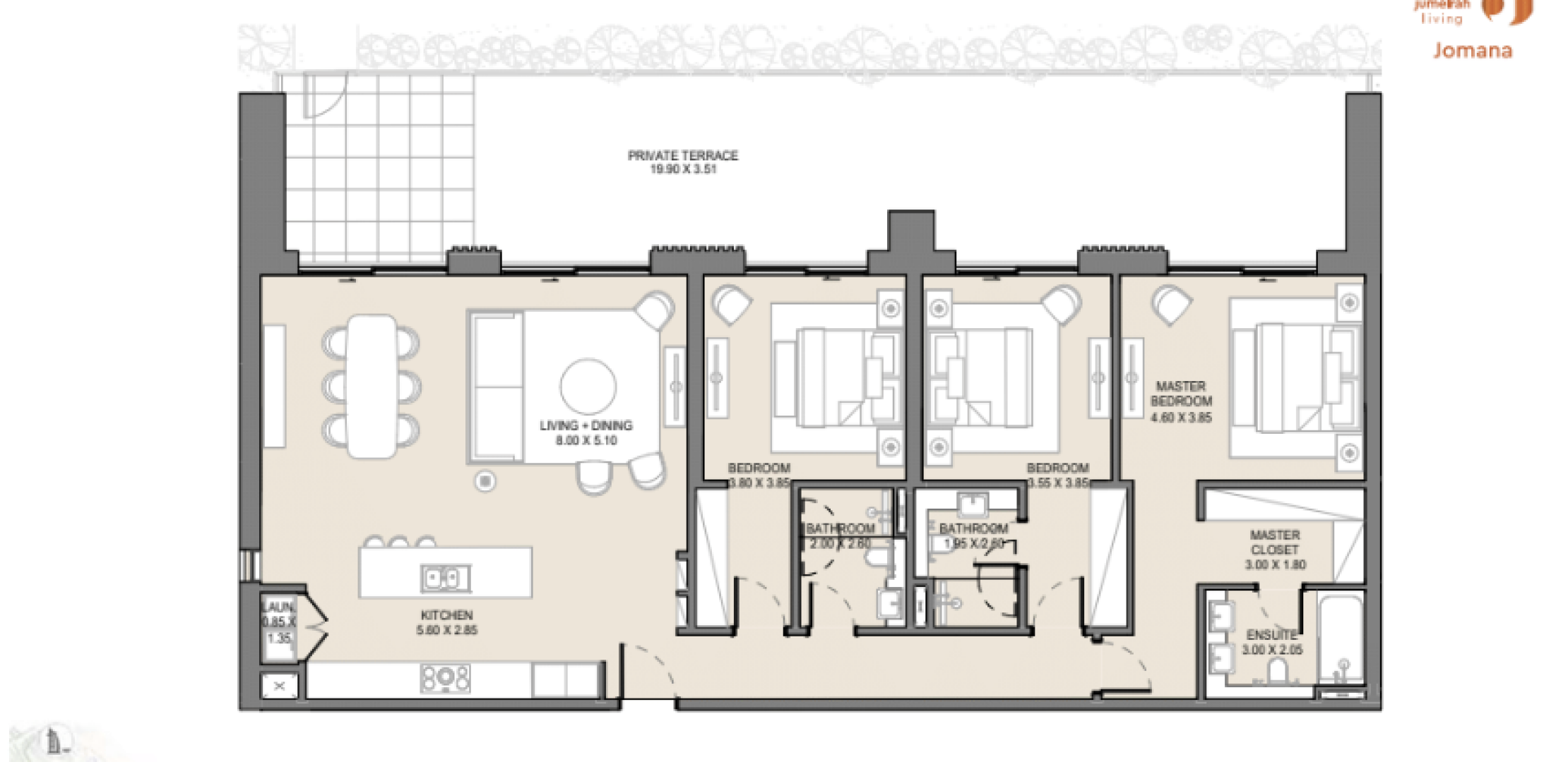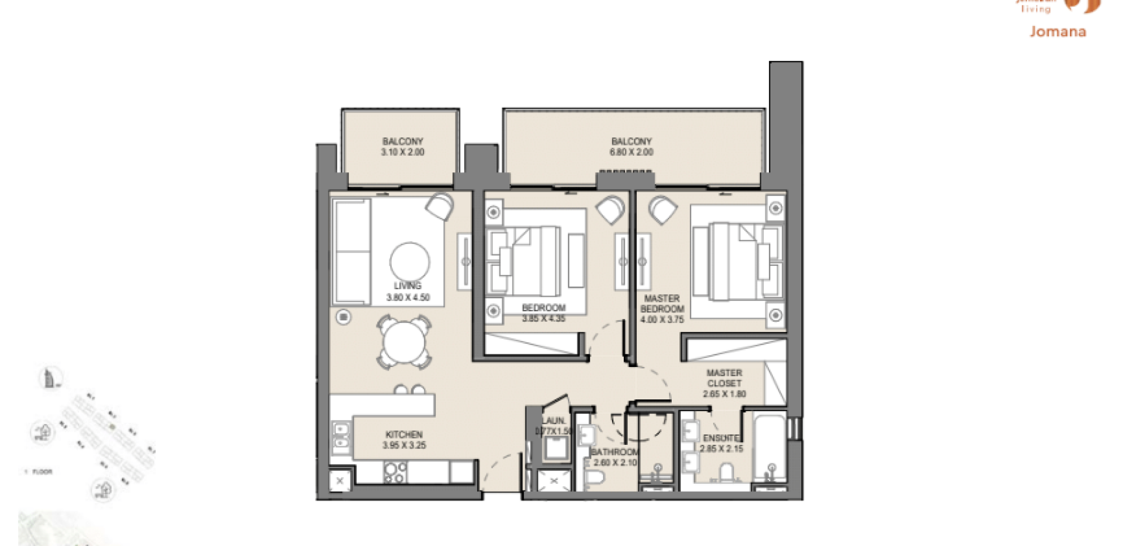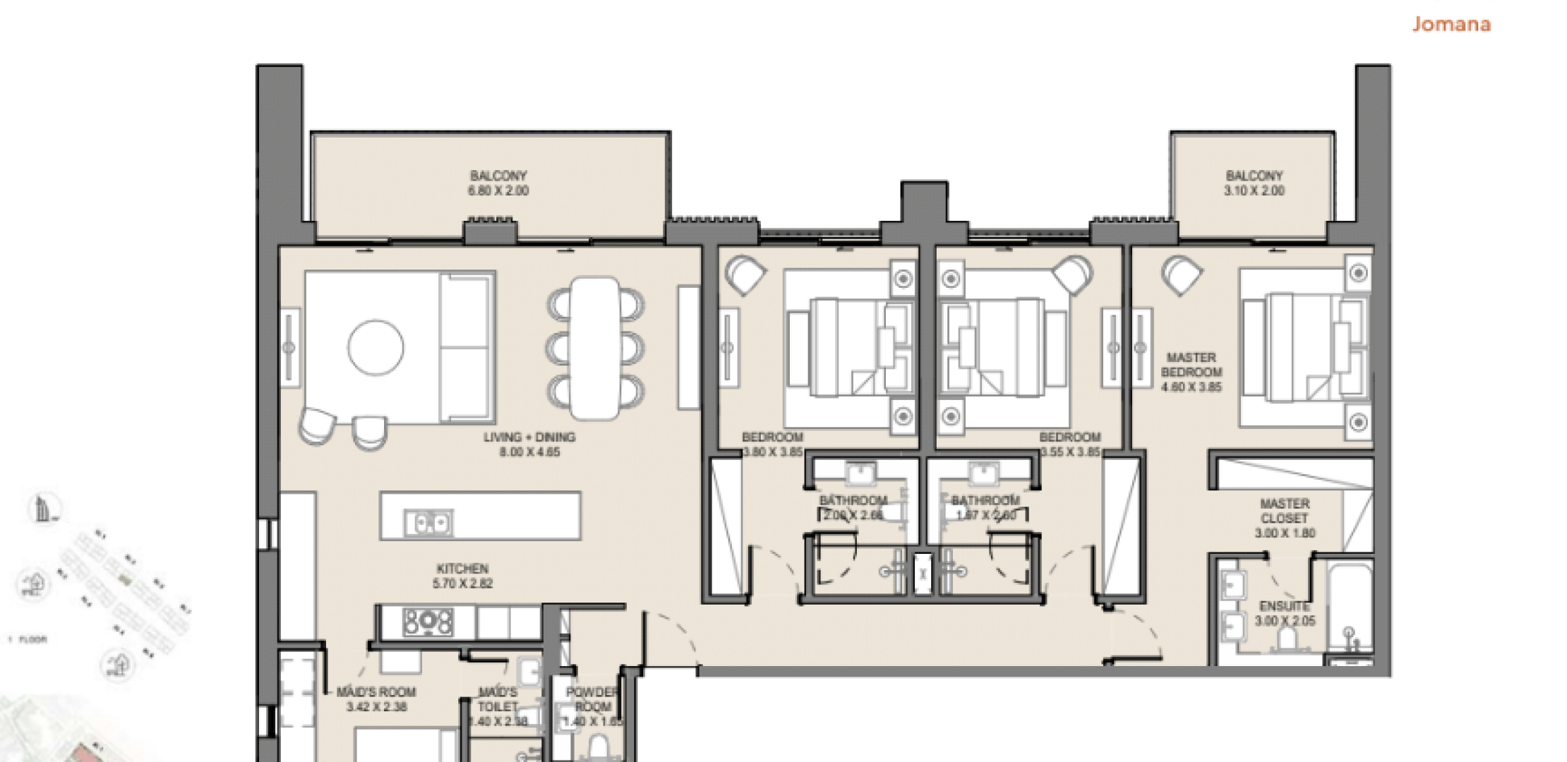 Апартаменты в Jomana отличаются современным дизайном с элементами традиционной арабской архитектуры. Площадь квартир варьируется от 74 до 317 квадратных метров, предлагая просторные жилые помещения с высокими потолками и большими окнами, обеспечивающими естественное освещение и великолепные виды. Каждая квартира оснащена балконом или террасой, а некоторые планировки включают отдельные комнаты для персонала.
