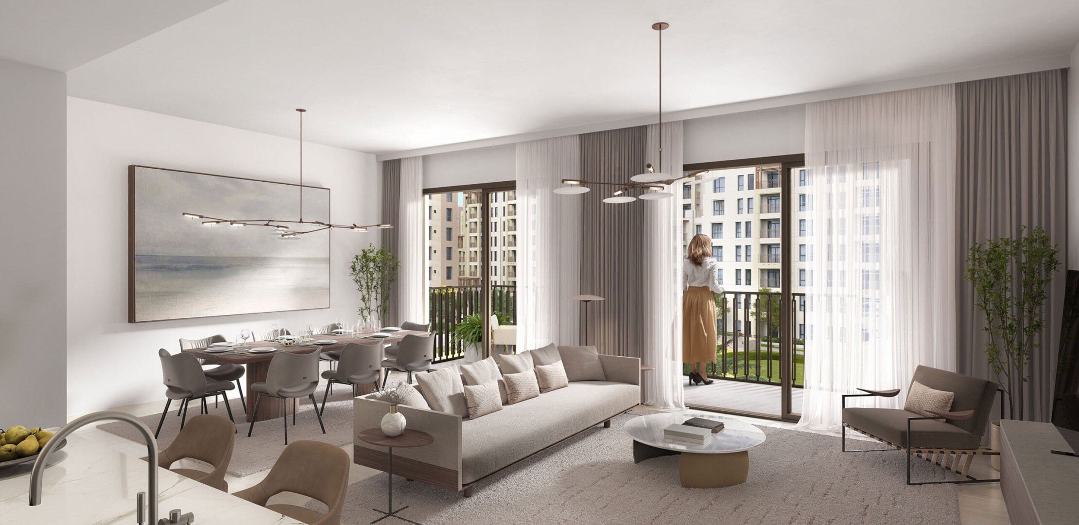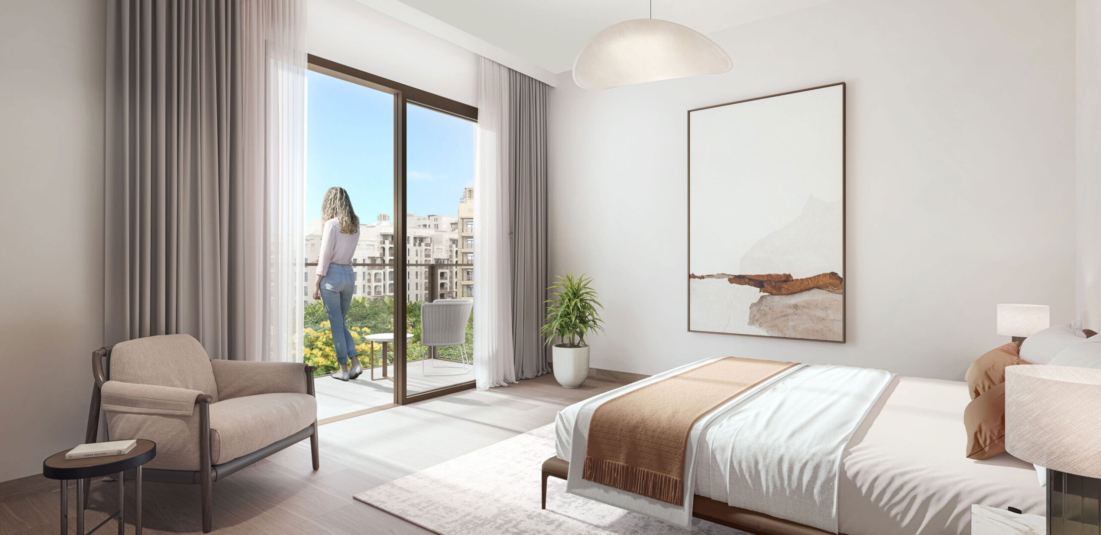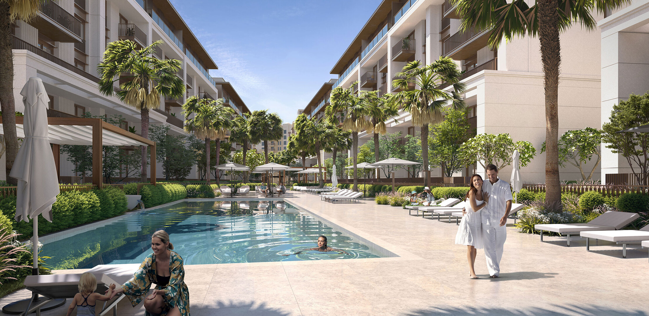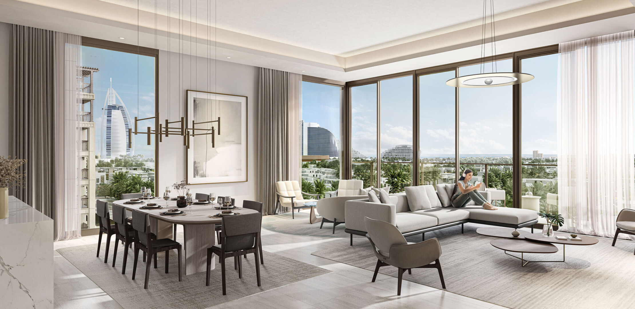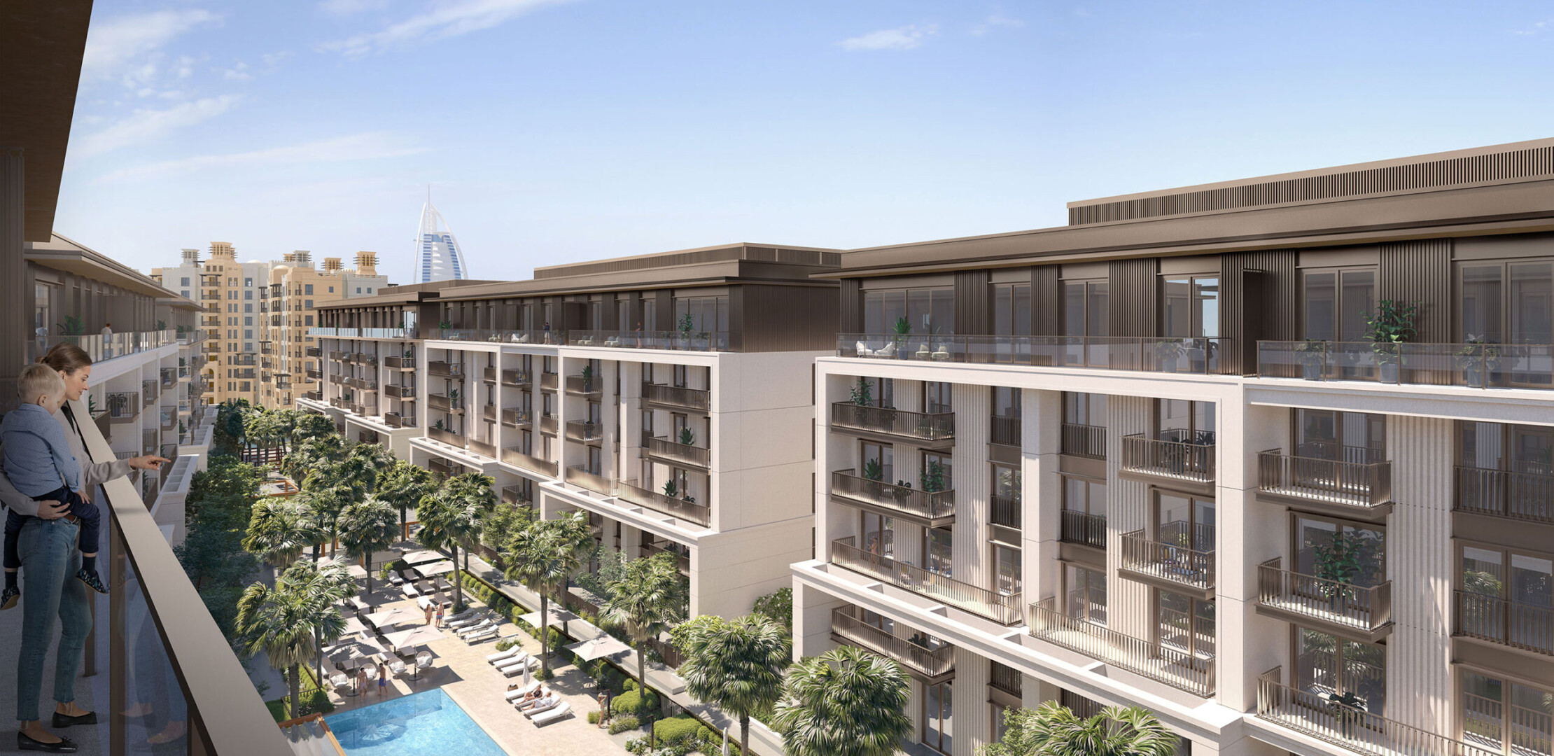 Апартаменты в Jomana отличаются современным дизайном с элементами традиционной арабской архитектуры. Площадь квартир варьируется от 74 до 317 квадратных метров, предлагая просторные жилые помещения с высокими потолками и большими окнами, обеспечивающими естественное освещение и великолепные виды. Каждая квартира оснащена балконом или террасой, а некоторые планировки включают отдельные комнаты для персонала.
